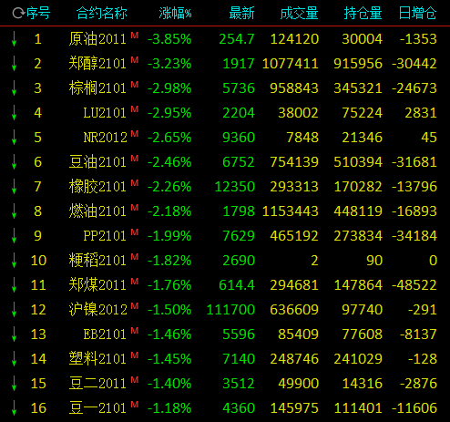 热点栏目9月30日,国内期市收盘分化明显,受供应忧虑影响,铁矿石大涨5%,带领黑色系走升,玻璃涨逾3%,焦炭涨近3%,螺纹、热卷涨逾1%,但是动力煤跌近2%;能化品走跌,原油、甲醇跌逾3%,橡胶、燃油跌逾2%;农产品涨跌互现,苹果涨近2%,鸡蛋涨逾1%,棕榈油跌近3%,豆油跌逾2%;有色中,沪锡涨逾2%。