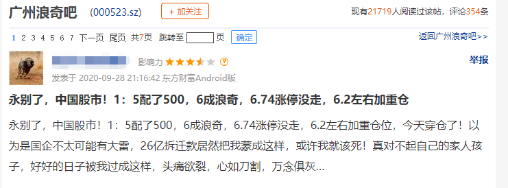虽然已经打开跌停,但股吧里仍是悲声一片。有股民声称“1:5配了500(万),6成浪奇”,引来大量同情。更多的投资者则在愤怒要求赔偿。