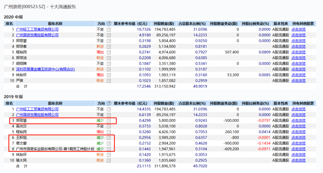 在大量股民“关灯吃面”之际,广州浪奇有多名“前十大”在上半年选择“获利离场”。对比广州浪奇2020年一季度和半年度前十大股东来看,吴炎汉、王炽旭、蒋文碧、郑丽慧4人均有减持,而前三人已在广州浪奇前十大流通股东名单中消失。
