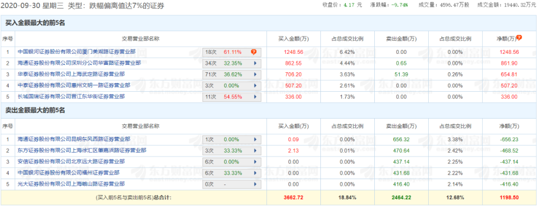 广州浪奇盘后数据显示,买五卖五席位均为券商营业部,中国银河证券厦门美湖路证券营业部买入1248万元,安信证券北京远大路证券营业部卖出437万元。