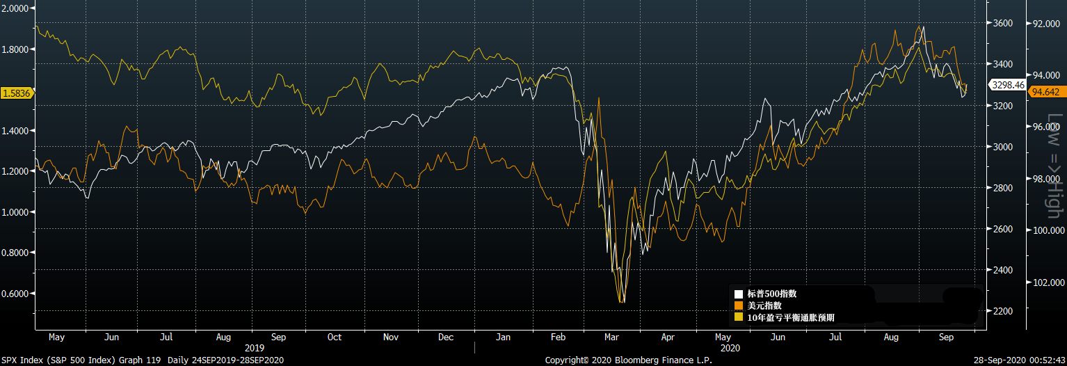 影响这两个市场的主要因素有两个,包括广泛的风险偏好和通胀预期。下图显示,美元下跌、美股上涨以及不断上升的通胀预期是同时发生的。而且短期内,这种相关性似乎将继续存在。美股大跌可能伴随着通胀预期下滑,这会给美国实际收益率带来上行压力,从而能推动美元走强。