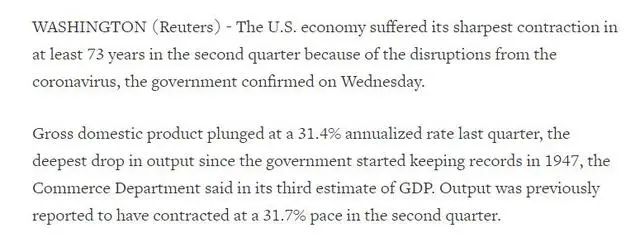 美国二季度GDP暴跌31.4%