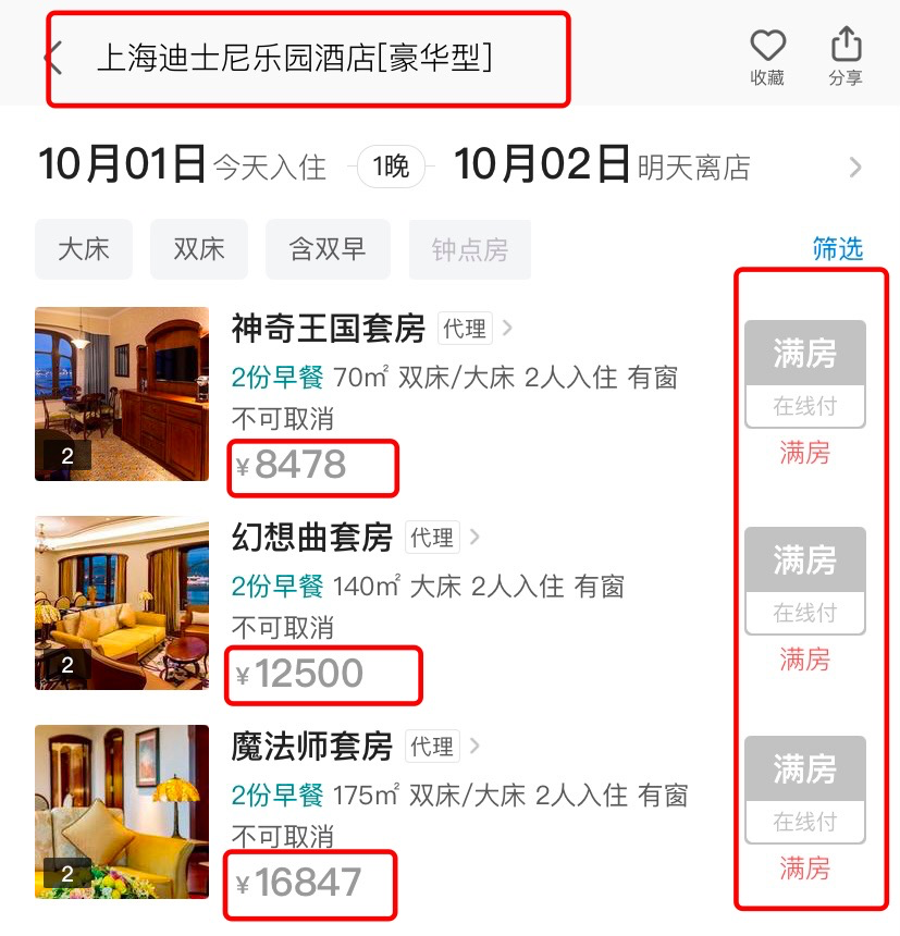 不过,值得一提的是,在美国迪士尼进行大面积裁员的同时,国内迪士尼乐园却在十一小长假迎来客流高峰。上海迪士尼酒店最便宜的房间已经涨价至近3000元,甚至还有套房的价格已经飙涨至16847/晚。虽然价格飙升但依然“供不应求”,多种房型早已被预订一空。