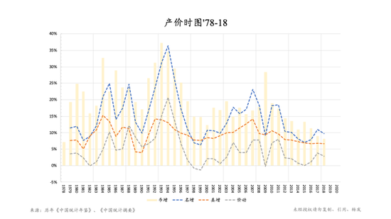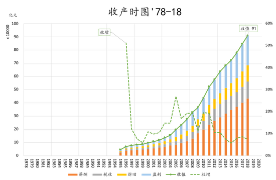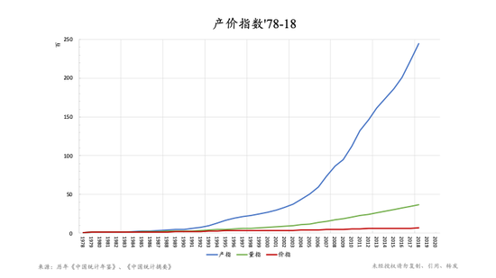 下面这张图中蓝线表示产值指数,1978年指数为100,2018年的名义产值为90万亿,对应指数为24500,亦即245倍于1978年的名义产值。扣除价格的影响,实际真实的增长是绿色线(约37倍),红色的线表现的是价格的增长(约7倍)。
