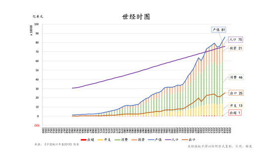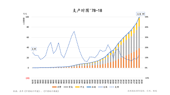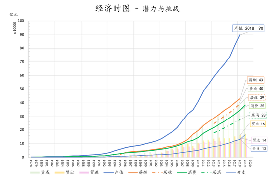 这张图的数据均是基于《中国统计年鉴》关于经济总量的公开数据,图中蓝色的线代表的是1978年-2018年的产值变化趋势,我们可以看到从90年代到2000年后有着一个迅速发展的过程。有了总量的概念,我们再来看看经济的结构,经济里最几部分内容居民消费、政府开支、投资、贸易进出口可以在上图中看到。首先讲一下很重要的一部分是消费(绿色实线),随着经济的增长也在逐渐的提升,跟消费相关的是收入问题,橘色线是薪酬的总量统计,可以看出居民的收入调查(橘色点线)、消费(绿色点线)与GDP总额的数量关系,这些基本趋势都是相互呼应的,也可以看出消费有一定的持续性,这也是让我们对经济潜力或者说恢复到什么程度的一个基本信心的来源。