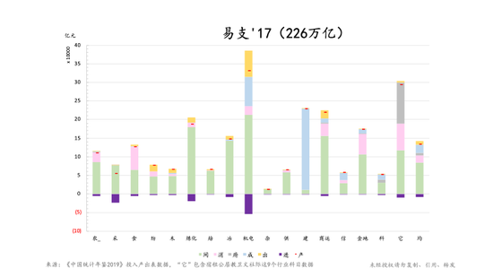 这张图从使用的角度来看,对不同行业,产品使用的目的构成,像所谓的中间产品,你是被其他行业买去的,不同行业生产的大部分卖给其他企业,柱中粉色部分属于最终消费,此外还有政府消费还有资本形成的投资,像建筑业基本都是资本形成,进口出口实际上对GDP的贡献是净的值也就是净出口(出口-进口)。