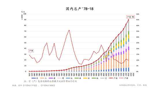 下面看一下1978年-2018年经济总量分行业的结构,除了刚才说的对于消费和投资的观察,这是根据《中国统计年鉴》提供的数据,可以看出来在农业、工业、建筑、商业、运输,住宿、餐饮跟旅行相关的行业、金融地产以及其它行业,(标准是20个行业),归在其它(它)中是电信、租赁、科研、公共设施、居民服务、教育卫生、文化、社会组织、国际组织等9个行业类别。