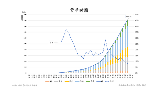 看了刚才的经济分类,我们还是要讲一讲货币,在经济发展过程中,我们的货币总量也是在快速的增长,按照统计局的分类货币分为企业单位的活期存款、定期存款、个人存款和其他类型的存款,还有M0。M0是纸币钞票,占比份额较小。根据人民银行统计数据,截止到2020年8月M2达到214万亿,M0是8万亿,还是有迅速增加的趋势。