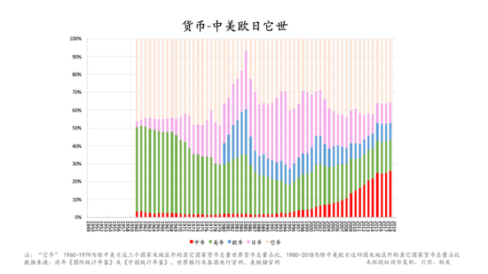 从这张图中可以看出不同国家及地区的扩张过程,早期的时候是美国(绿柱)在世界总量中占比很高,但是趋势在逐渐缩减,日本(粉柱),在70—80年代有很快的扩张,最后日本也是经历了一段严重通胀的过程,中国是在2003年以后明显扩张,在世界货币占比大规模提升。货币扩张过度就可能出现负利率的现象。