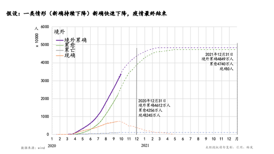 因为疫情初期是出现过可以通过防疫工作让新确从高点恢复到零,如果按照刚才看到的趋势,我们用这段经验来预测的话,现在累计确诊已经达到很高的数量了,如果现在系统采取隔离措施,可能有大概三五个月基本上就可以趋于平稳,最后结果是5千万人左右的累计感染,实况已是3千多万人了。这是第一种可能,也是较好的情况。