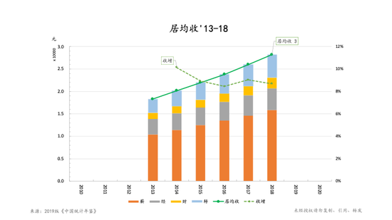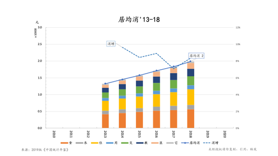 我们再来看看消费,消费基本上有8种,食品、衣着、住房、用品、交通(包含通讯)、教育、医疗、其它,这些是基本占比,增长幅度在8%—9%,消费其实跟收入趋势相关性很强,收入增长了,消费也随之增长。