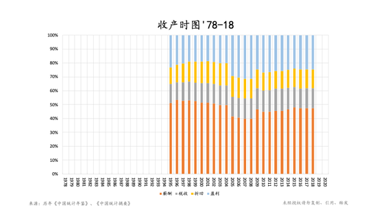 我们再看收入从行业的角度分,也可以从分配的角度,员工的基础薪酬、政府税收、还有企业投资的折旧以及企业的盈利,从占有额度来衡量可以看出来这个结构总体来说基本上稳定,但是收入在2003年以后薪酬降低了不少,企业盈利占比相对大一点,2008年危机以后又有了新的调整。