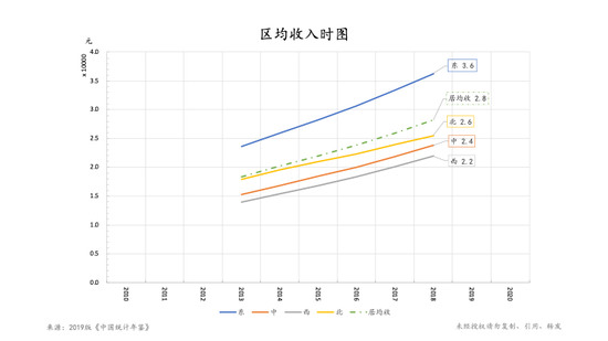 从分地区收入的这张图中,东部的平均收入显著高于其他三个区域的人。