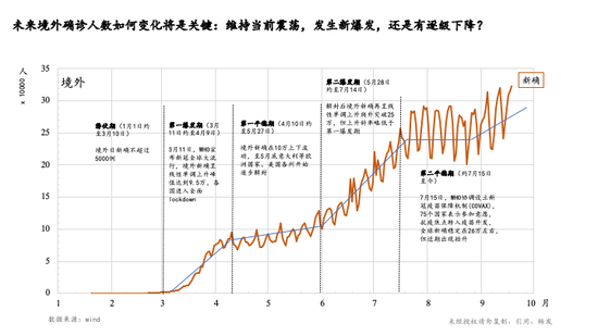 如果我们把新增确诊的情况放大来看,有一个规律,从开始比较少,3月份起开始上升,这是第一个阶段的发生,逐渐开始出现波动性直至趋于平稳,这个时候国外开始纠结到底是防疫还是复工,疫情让我们理解了经济需要长周期的考量同时也会有一个短的周期直接表象,就像骑自行车,你不停地骑,车不会停,经济亦是如此,出现系统性传染病的情况,就得隔离,一旦隔离封闭,整个经济开始停滞。也可以理解国外的纠结,到底是选择持续停产抗疫还是复工复产。从数据中可见,开始时迅速增加的势头经过一个反应周期后得到了控制,很快又开始攀升。攀升以后,大家又进一步严格一点控制,平稳一段,但是最近这段时间又有提升。