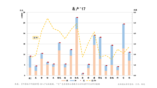 你可以看出来不同的行业倍数,像农业,因为它的基本投入比较少,一大半主要是农民的收入,像刚才讲了,农民的收入其实在整个经济占比中不到10%了,虽然农村人口还有40%,城镇人口的统计也是如此,虽然城镇人口有8亿,所谓城镇人口8亿跟北京100%城市化了,其实城市也有很多非农,这是我们的统计结构的问题,不完全反映真实的情况。