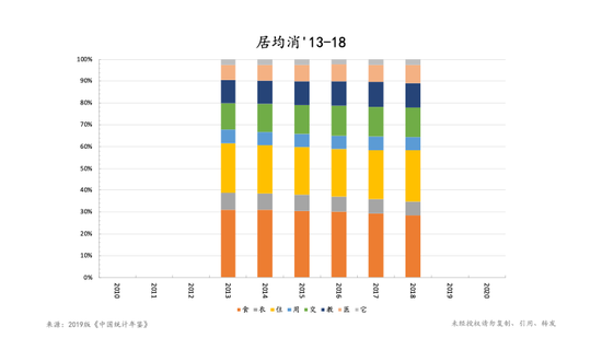 这张图很容易可以看出近年来几种类型消费比例的变化,相对比较稳定。
