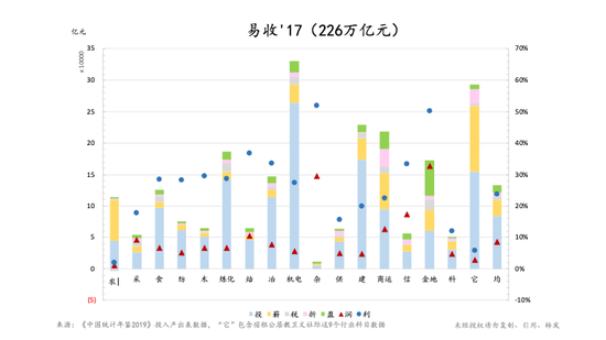 看完价格以后,我们可以通过这张图对市场的规模有一个进一步的理解,分为农业、采矿、食品、纺织、木材加工、炼化、非金属材料、冶金、机械电子和其他制造科目、供应业、建筑、商业、运输、金融、地产、科技和其它,其它又包括了(宿租公居教卫文社际9个行业),主要可以看出来蓝柱的是增加值,所有蓝柱的增加值加起来就是90万亿。