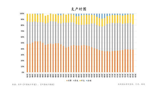 另外一个比较重要的经济结构成分是政府的开支(开支),有人看成是公共消费,或者说是公共服务的基本需求,道路维护、基础设施维护、政府办公成本等等,2018年开支占经济约15% ,消费占39%,资本形成(资成)占45%,资成也就是投资,是在中国经济总量中比较突出的占比成分,尤其是在2003年以后超过了消费。