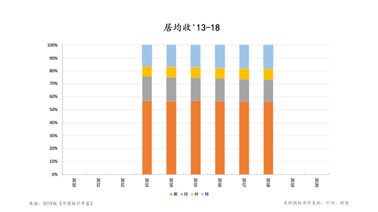看了经济结构,我们也看一下居民的收入,如果我们从消费市场来看,居民收入可能跟消费更直接相关。根据统计年鉴资料显示,居民的收入基本构成由四部分组成薪酬、经营收入、财产收入、转移支付,因为我们的就业结构有中国特色,一个是个体户,一个是私营企业,我看了一下私营企业大概3千万家,但是平均一个企业只有6、7个人,1亿家个体户平均2人。总体来说,居民收入保持在大致平稳的水平,略低于名义增长的速度。