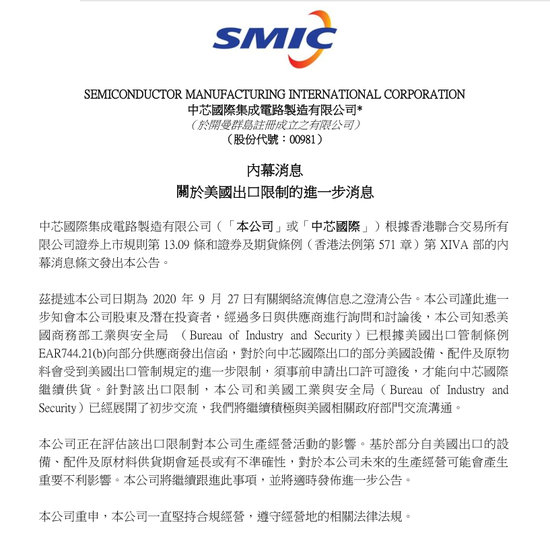 中芯国际昨晚公告称,经过多日与供应商进行咨询和讨论后,公司知悉美国商务部工业与安全局已根据美国出口管制条例向部分供应商发出信函,对于向中芯国际出口的部分美国设备、配件及原物料会受到美国出口管制规定的进一步限制,须事前申请出口许可证,才能向中芯国际继续供货。