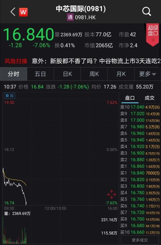受上述消息影响,中芯国际港股今日开盘报17.60港元,下跌2.87%。截至发稿,盘中一度下跌逾7%。