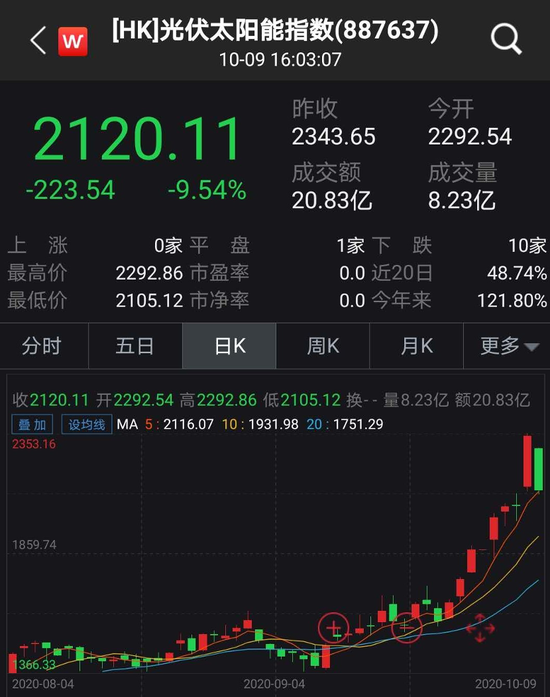 从近期市场表现看,港股光伏太阳能板块表现并不差劲。Wind数据显示,10月1日至10月8日期间,光伏太阳能指数大涨25.01%,10月8日,指数一度创下2353.16点的历史新高。