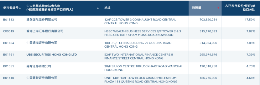 根据港交所披露易来看,市场中介者/愿意披露的投资者户口持有人最大建银国际证券,持股量在7.03亿元,占已发行股份的17.59%,其次是香港上海汇丰银行、中国通海证券等券商。