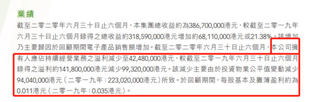 公开资料显示,香港金融集团曾于8月31日发布2020年中期业绩,该集团期内收益为3.87亿港元,同比增长21.37%。毛利为1078.6万港元,同比减少45.8%。公司拥有人应占期内溢利为4247.5万港元,同比减少70%。每股基本盈利为0.011港元,不派息。根据公告显示,期内公司拥有人应占期内溢利减少主要由于投资物业公平值变动减少9404万港元所致。