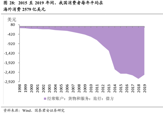 综合免税概念以及国货潮概念,我们认为海外消费回流以及国产商品市场份额提升将出现新的动能。前期报告中,我们强调国内居民在海外消费的体量在万亿人民币以上,如果有25%-50%回流,可额外拉动居民最终消费0.5-1个百分点(图29)。服务消费方面,“经常账户”下货物和服务的“旅行”项借方额,发现2012年以后,我国消费者在海外的消费额明显增长,特别是2015至2019年间,我国消费者每年平均在海外消费2579亿美元(图28)。如果我国居民海外消费25-50%回流,按照海外消费对应的人民币数额以及相应年份GDP最终居民消费,平均可额外拉动GDP居民最终消费0.49-0.98个百分点。若叠加海外实物消费的线上销售,那么整体海外消费体量将更大,消费回流的作用将更加显著。