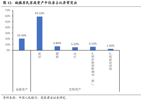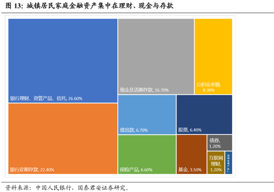 在家庭资产构成中,我国城镇居民家庭资产主要以实物资产为主(占总资产79.6%),其中住房是重要构成(占总资产59%,图12)。金融资产中,银行理财、定期存款、现金及活期存款占比超过65%。股票资产和基金资产占比不到10%,居民投资方向非常有限,现金持有率过高(图13)。