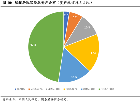 资产端方面,中国家庭资产分布分化显著,财富集中在少数家庭。根据最新的央行统计调查,2019年总资产排名前10%家庭,占国内家庭总资产比例接近50%。排名后40%的家庭,占总资产比例不及10%。高收入家庭户均总资产相对于最低收入家庭户均资产接近14倍差距。