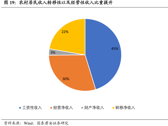 我们进一步观察居民的收入结构特征,城乡居民整体创收能力在不断增强,收入来源也呈现多样化的特征。特别是农村居民工资性收入、经营净收入的占比超过七成,体现出农村居民收入对于农业生产依赖已经相对较弱,但这种收入来源格局也意味着,疫情冲击对于农村居民的影响相对更大。由于经营性收入的大幅降低以及工资性收入的走弱(临时性雇佣、中小微企业雇佣),导致农村居民的收入整体冲击强于城镇居民,进一步拉大了收入分配差距。