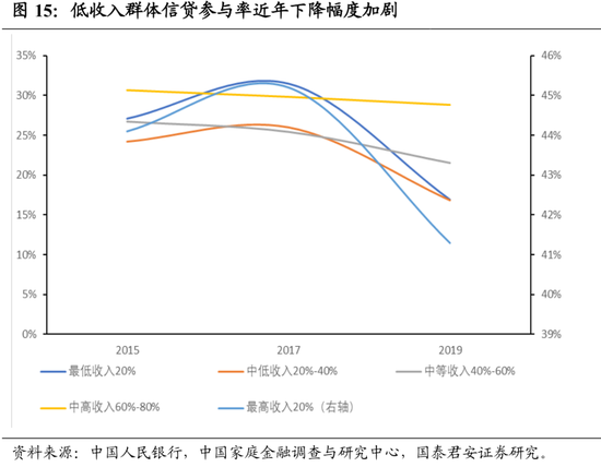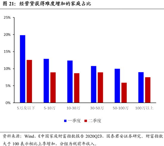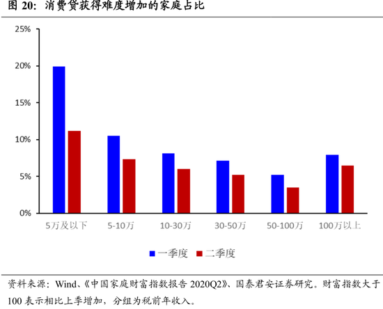 但是疫情的政策刺激当前也带来了信贷下沉,低收入群体信贷获得难度在二季度有所缓解(图20、21)。而在信贷资源的使用上,不同年龄层家庭的使用方向存在明显差异,年轻家庭主要用于购房购车,中年家庭主要用于教育,老年家庭主要用于医疗。