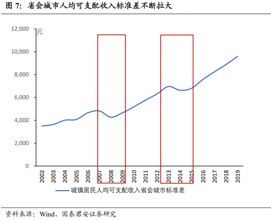 ,疫情冲击导致分配不均的进一步加剧。回顾近三年来,不同收入层收入增速大致表现为高收入群体增速趋缓,中低收入群体增速提升。但是两个增速差仍持续带来收入分配不均的加剧:一是城镇与农村的高收入户群体增速差持续在拉大,二是城镇居民中,高收入户群体的增速虽然趋缓,但依然高于其他城镇居民收入层的增速。此外,从地域角度来看,收入分配在不同地区与省份的差异也在不断加大(图7)。