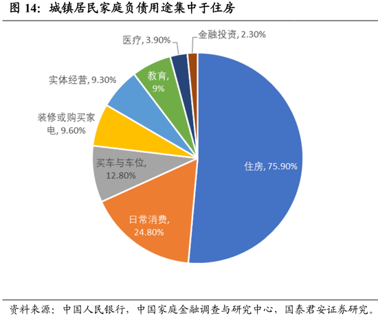 (4)中国家庭的负债结构相对单一,构成主要以房贷为主。家庭负债中用于消费的比例不及三成。