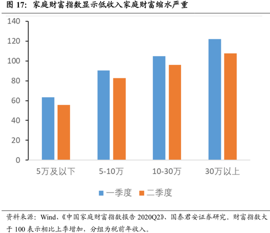 疫情冲击在年内导致上述收入分配不均格局的进一步加剧。我们从农村外出务工人员状态可以感知中低收入群体所受冲击巨大,一方面工作岗位出现减少,另一方面月均收入大幅下降后修复乏力(图16),整体对消费拖累显著。家庭财富角度,二季度低收入家庭以及自由职业家庭财富指数下行较大(图17)。