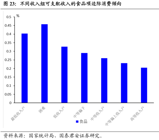 (2)分项方面,食品类支出的边际消费倾向相对强于其他分项,且随着收入层级的上升而下降(图23)。