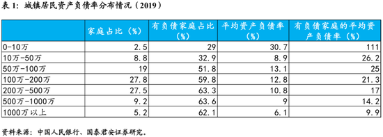 (2)资产分布不均与负债相对集中,导致国内家庭部门净资产的分化现象强于总资产分化,部分低收入家庭已经存在资不抵债现象。