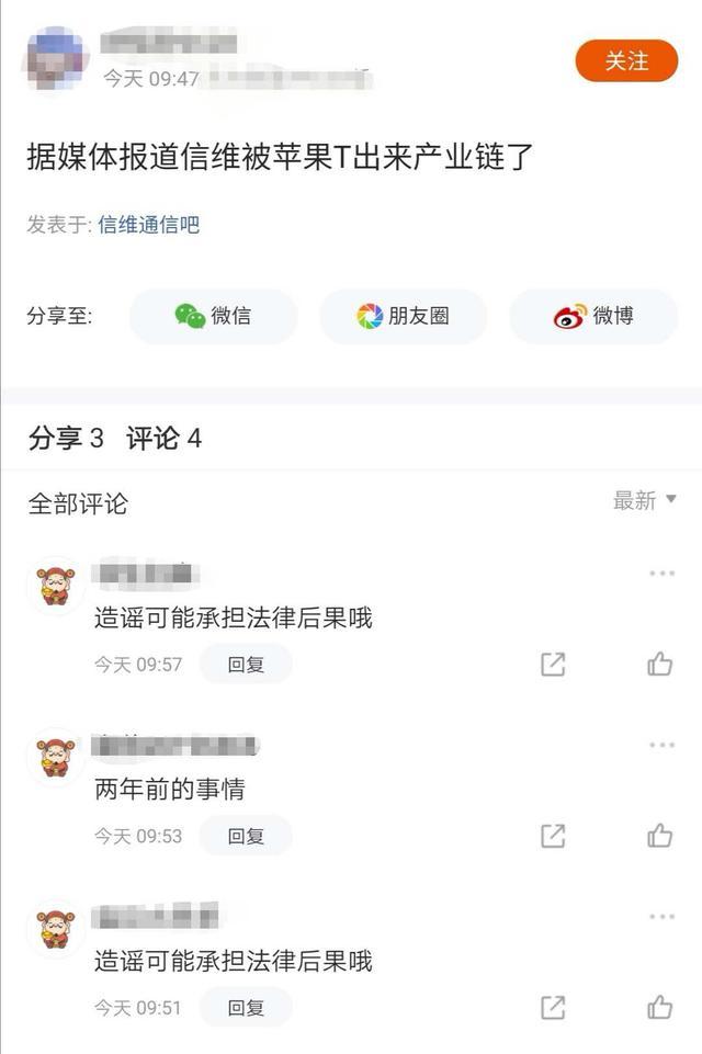 今日早间,有网民发帖写道“据媒体报道信维被苹果T出产业链”。不过,这一言论遭到其他网友质疑。