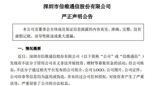 9月30日,信维通信公告称,“有不法分子冒用公司名义非法开展投资、理财等募集资金的活动。”