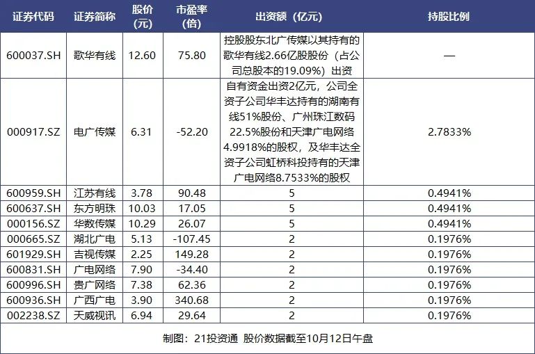 受该消息影响,广电系公司股价10月12日迎来普涨。截至收盘,歌华有线涨8.82%至13.08元/股。
