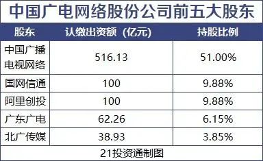 前五大股东包括中国广播电视网络有限公司、国网信通(600131.SH)、阿里创投、广东广电、北广传媒,其中国网信通和阿里创投均出资100亿元,持股9.8813%,并列中国广电网络第二大股东。