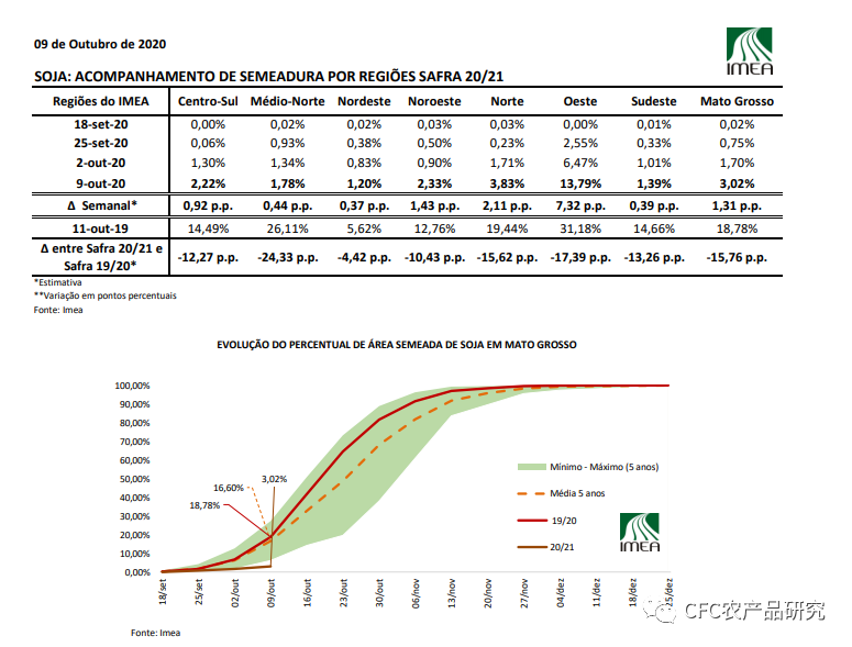在旺盛的出口、压榨及不及预期的产量下,USDA10月报告的调整大刀阔斧,美豆新季库存被超预期下调至2.9亿蒲式耳,低于3亿蒲式耳结转库存的美豆拿到大行情的入场券。此外,在北美利好继续兑现的同时,南美干旱题材也得到较好发酵。不利天气对巴西播种进度形成较大阻碍,除了影响潜在单产之外,也可能影响后续种植面积的增长并推迟南美豆上市时间。