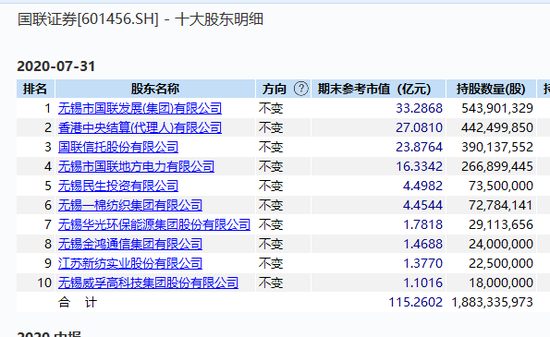 从股东背景来看,国联证券前三大股东均为无锡市国资背景。根据国联证券2020年半年报,无锡市国联发展(集团)有限公司、国联信托股份有限公司、无锡市国联地方电力有限公司分别持股22.87%、16.41%、11.22%,无锡市国资委为公司实际控制人。