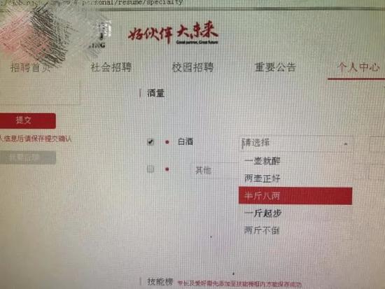 求职者在其官网注册登陆后,在个人特点栏里赫然出现了“酒量”的标签,点击标签分别显示的是“一壶就醉”、“两壶正好”、“半斤八两”、“一斤起步”、“两斤不倒”等选项。