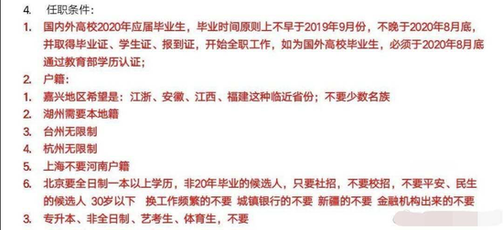 网上就曾经流传过某银行苛刻的招聘条件,精确到户籍所在地,甚至还排斥某些机构出来的求职者。不过,这份要求并未出现在官网之中,新流财经跟发布者确认真实性,得到的回复为这是一份真实的招聘需求,但一般并不会刻意写出来,不满足的基本都会被pass掉。