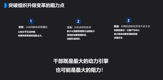 刁志中谈到,组织升级变革一定不会是一帆风顺的,主要有三大阻力点。一是思想,因为每个企业家自己的认知决定着企业发展的高度,是企业的天花板,如果企业家的认知不突破,可能会限制企业的规模和潜力。二是方法,不能说只有想法和干劲,而行动一团糟,要做到知行合一,形成体系,从顶层设计到战略落地形成一个闭环。三是氛围,企业家要带领公司所有员工完成任务使命,让大家心往一处想、劲往一处使,营造出创新变革的文化氛围。在整个过程中,干部既是最大的动力引擎,也可能是最大的阻力,因此需要扬长避短各司其职。