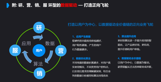 “布当局”方面,刁志中分享了以数据为驱动力,实现与客户的正向互动,打造“环形价值链”的经验。刁志中举例分析道,一款软件的用户反馈,过去往往需要靠猜想、或者是凭感觉。具体哪些功能使用体验好,使用频次高,后台无法得知。如果将产品和服务云化之后,“爆点”应用能以统计数据的形式反馈回来,供后续进一步优化算法、进行功能取舍。以数据驱动全价值链的正向业务飞轮,从结果上来看能切实提升产品应用体验,从流程上看能搜集到一手反馈,找准问题彻底攻关;价值链也在不断良性循环中实现优化,打通不同岗位、不同职能人员的信息壁垒,消除信息不对称,实现高效协同。