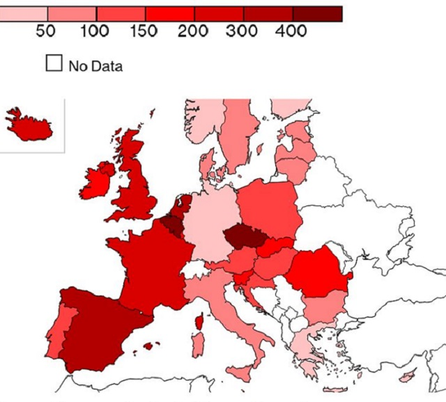 下图显示了最近14天,欧洲每10万人中疫情感染情况,颜色越深表示情况越严重