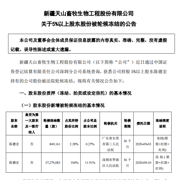此外,天山生物最新公告,公司近日获悉公司持股5%以上股东陈德宏持有的公司股份被法院轮候冻结。
